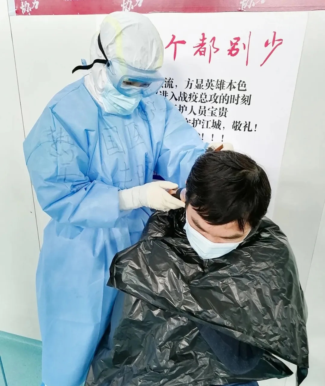 1艙有康復(fù)人員想理發(fā),手頭沒(méi)有工具,朱晴護(hù)士長(zhǎng)得知后,聯(lián)系下個(gè)班次護(hù)士帶來(lái)推子,給大家理發(fā)?!翱茨銊?dòng)作很嫻熟啊,以前練過(guò)的吧”,“圍觀群眾”打趣道。“現(xiàn)學(xué)現(xiàn)賣(mài),大家要求不要太高,有壓力??!”朱晴說(shuō)。一直推到推子沒(méi)電,朱晴給6位康復(fù)人員簡(jiǎn)單修剪了頭發(fā)。得知朱晴是西安醫(yī)療隊(duì)的護(hù)士,大家都親切的稱(chēng)她“肉夾饃”!