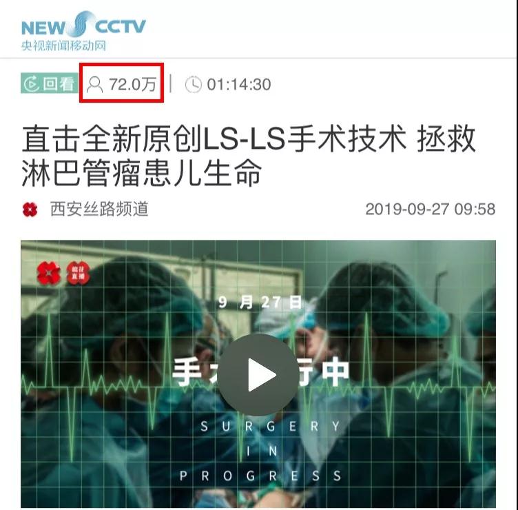 開(kāi)診后的第一個(gè)手術(shù)日,西安電視臺(tái)全程直播了全新原創(chuàng)LS-LS手術(shù)技術(shù)拯救淋巴管瘤患兒生命的手術(shù)過(guò)程!央視新聞移動(dòng)網(wǎng)、今日頭條客戶(hù)端、廣東廣播電視臺(tái)觸電新聞、西安網(wǎng)微博等同步播出西安國(guó)際醫(yī)學(xué)中心骨科醫(yī)院拯救淋巴管瘤患兒的全過(guò)程。據(jù)不完全統(tǒng)計(jì),在線觀看直播達(dá)百萬(wàn),僅央視新聞移動(dòng)網(wǎng)的觀看量達(dá)72萬(wàn)!