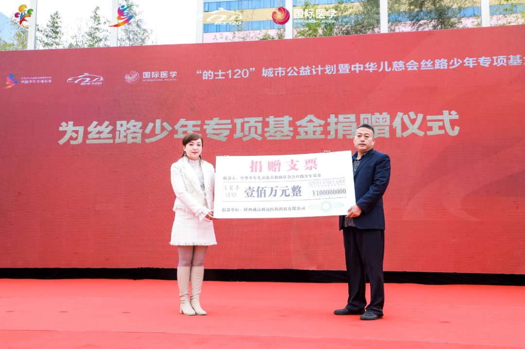 活動現(xiàn)場,中華少年兒童慈善救助基金會理事長兼秘書長王林為絲路少年專項(xiàng)基金進(jìn)行了授牌。陜西威高致遠(yuǎn)醫(yī)藥科技有限公司傾情捐贈100萬元善款,用于為全國境內(nèi)0-18周歲的腦癱、自閉癥、呼吸疾病、先天性心臟病、先天性小耳畸形等困境患兒提供醫(yī)療服務(wù)。
