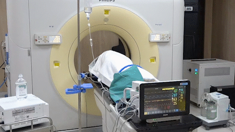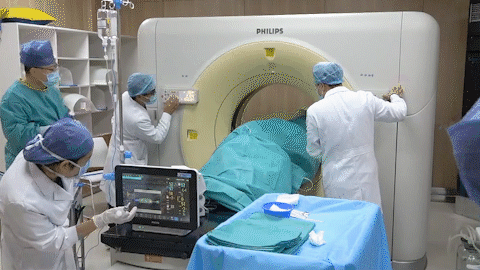 經(jīng)過放射治療中心陸軍主任的細(xì)致準(zhǔn)備與精準(zhǔn)定位,屈女士的射頻治療開始了?;颊卟扇∽髠?cè)臥位,麻醉醫(yī)生立即進(jìn)行靜脈全麻。在CT引導(dǎo)下,醫(yī)生手中的“消融針”,按照既定路線“穿引”,快速、準(zhǔn)確地插入右肺病灶部位,啟動射頻機(jī)器進(jìn)行了精準(zhǔn)的消融,右肺局部癌細(xì)胞一下子就被超高溫成功滅活了!經(jīng)CT掃查,無血氣胸;患者生命體征平穩(wěn)。2個小時后,屈女士就下地活動了。