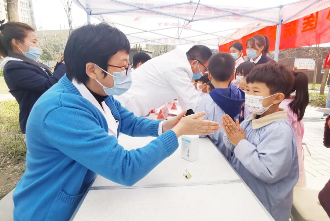 在創(chuàng)匯社區(qū)義診現(xiàn)場,高新第八幼兒園的小朋友們在醫(yī)護人員的帶領(lǐng)下學(xué)做“洗手操”。醫(yī)生用通俗易懂的語言,詳細講解了洗手的重要性及如何正確洗手遠離細菌等相關(guān)知識,分步驟教會了小朋友們?nèi)绾握_洗手。同時,醫(yī)護人員還為小朋友們介紹了體檢車的功能及用途,并帶領(lǐng)大家進入體檢車參觀。