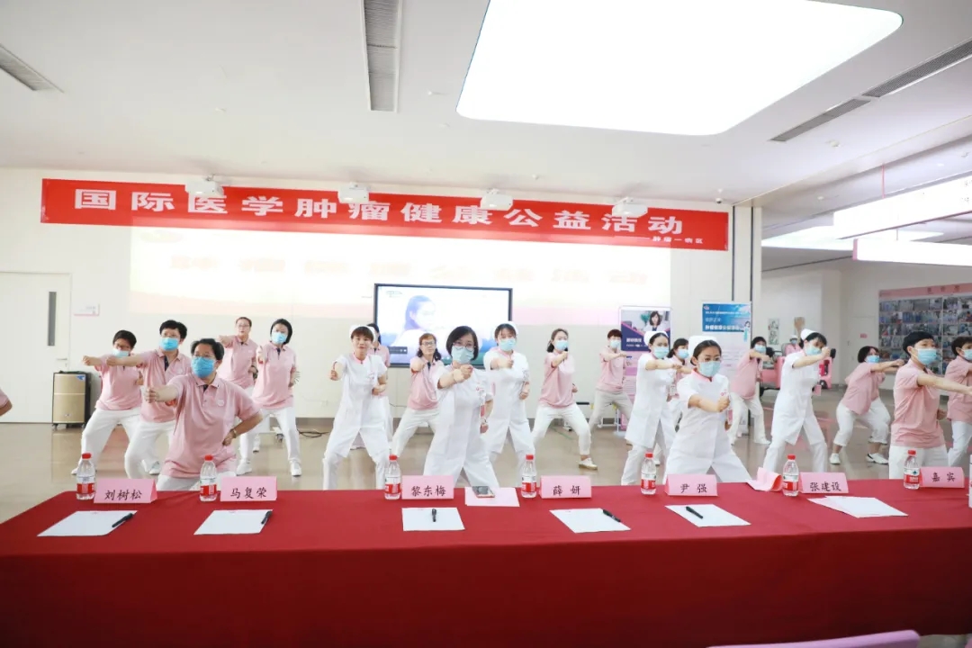 腫瘤一病區(qū)的醫(yī)護(hù)人員和志愿者們共同演練了一段八段錦,隨后的健康知識問答和歌曲快閃環(huán)節(jié)將活動氛圍推向高潮,大家爭先恐后地舉手搶答,現(xiàn)場問答也促進(jìn)了對于腫瘤防治、康復(fù)知識的推廣。最后,大家合唱歌曲“相信我們會創(chuàng)造奇跡”,積極、歡樂的氛圍縈繞不息?;顒幼詈?,薛妍副院長、劉樹松教授和張俊美醫(yī)生對患者的提問進(jìn)行了耐心、細(xì)致的解答。