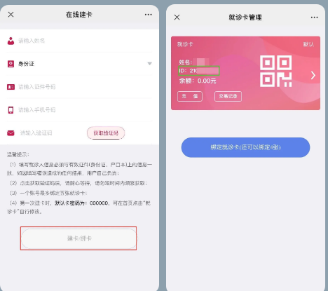 (1)沒有就診卡的人員,請(qǐng)輸入個(gè)人信息完成就診卡綁定。綁卡后,獲得個(gè)人ID號(hào)。(如圖所示)
