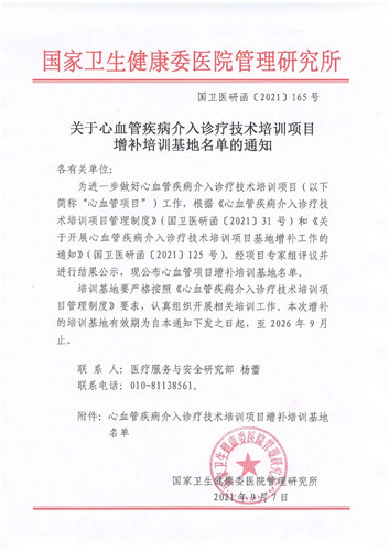 9月7日,在國家衛(wèi)生健康委醫(yī)院管理研究所發(fā)布的《關(guān)于心血管疾病介入診療技術(shù)培訓(xùn)項目增補培訓(xùn)基地名單的通知》中,西安國際醫(yī)學(xué)中心醫(yī)院榜上有名,這標(biāo)志著我院已成功躋身于國家級心血管疾病介入診療醫(yī)療機構(gòu)行列,同時也標(biāo)志著我院成為陜西省冠心病介入培訓(xùn)基地之一,肩負(fù)心血管介入醫(yī)師的規(guī)范化培訓(xùn)的使命,造福更多的心血管疾病患者。