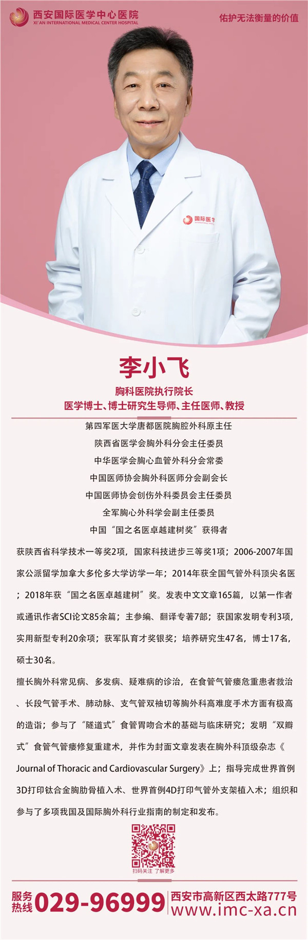 2021年11月,李小飛來到西安國際醫(yī)學(xué)中心醫(yī)院任胸科醫(yī)院執(zhí)行院長。李小飛兢兢業(yè)業(yè)、忘我工作,只為患者重返健康,感受生命的美好;勇于創(chuàng)新、不辭辛勞,只為攻克醫(yī)學(xué)難題而前行;醫(yī)者仁心、大志于胸,為更多的患者保駕護航,為他們帶來重生和希望。