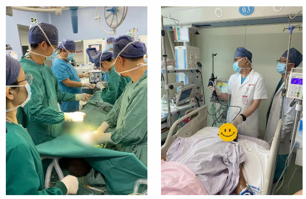 當(dāng)晚11:50分,胸腔外科、呼吸與危急重癥醫(yī)學(xué)科、麻醉手術(shù)中心以及心臟外科共同為患者實(shí)施手術(shù)。在麻醉手術(shù)中心的配合下,先由歐陽(yáng)海峰副院長(zhǎng)采用支氣管鏡技術(shù)進(jìn)行金屬覆膜支架置入術(shù),但由于腫物封堵約95%的氣道區(qū)域,支氣管鏡下無(wú)法將腫物切除。李文海副院長(zhǎng)隨即實(shí)施右全肺切除術(shù)。術(shù)中,心臟外科二病區(qū)程亮主任采用體外膜肺氧合(ECMO)為患者維持氧飽和度及肺部血供。歷經(jīng)10小時(shí),手術(shù)順利完成。