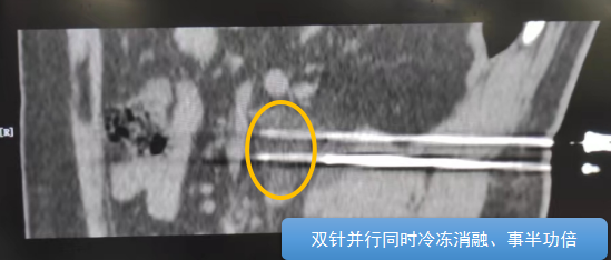 這個(gè)患者病變位置刁鉆,穿刺難度大,冷凍消融的難點(diǎn)在于既要不損傷膈肌和肺組織,同時(shí)又要盡最大可能完全消融腫瘤。術(shù)前陳寶瑩主任、李鐵柱教授、兀云飛醫(yī)生詳細(xì)設(shè)計(jì)進(jìn)針路徑、布針計(jì)劃,術(shù)中微創(chuàng)團(tuán)隊(duì)協(xié)調(diào)配合,李鐵柱教授仔細(xì)操作,精準(zhǔn)到位,順利完成兩個(gè)病變的布針,遂啟動(dòng)治療,先快速降溫到-150多度,再升溫至15?,經(jīng)過(guò)兩個(gè)循環(huán)反復(fù),即刻觀察到病變完全被冰球覆蓋,同時(shí)周?chē)K器無(wú)損傷,術(shù)中患者幾乎沒(méi)有疼痛,還和醫(yī)生聊起了天。
